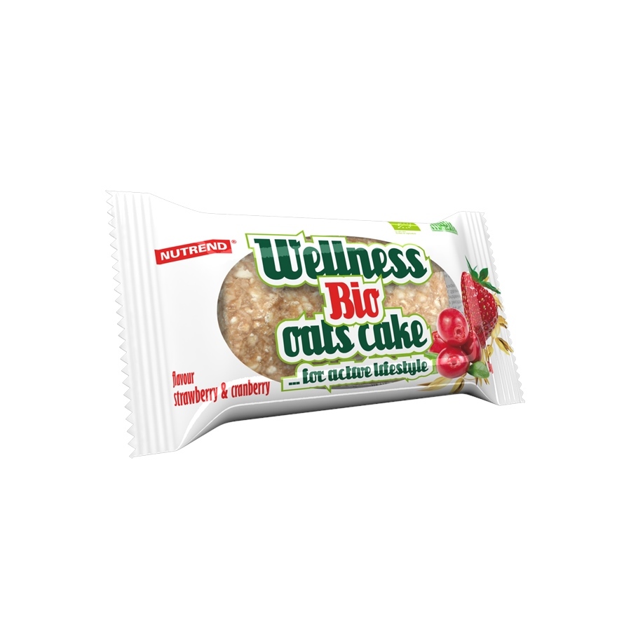 BIO WELLNESS OATS CAKE Strawberry – cranberry: organic oat flakes 44 %, organic glucose syrup, organic candied cranberries 10 % (organic dried cranberries, organic apple syrup, organic sunflower oil), organic glucose-fructose syrup, organic palm oil, emulsifier rape lecithin, dried organic milk, natural aroma, natural antioxidant (Origanum vulgare extract).