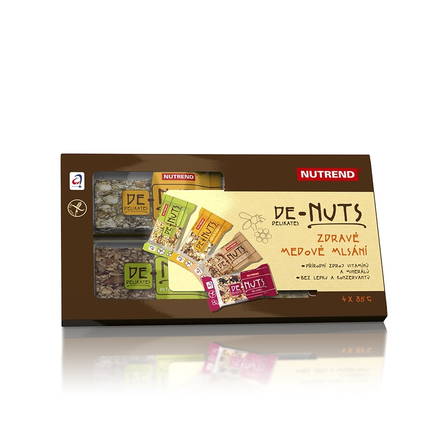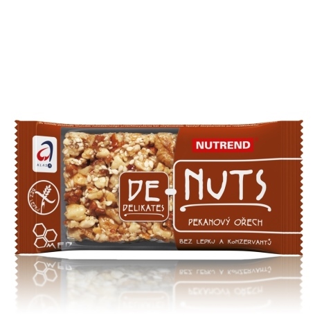 Denuts pecan: pecans 23%, peanuts, walnuts, glucose syrup, sesame, fructose, honey 4%, emulsifier rape lecithin. The product contains allergens pecans, peanuts, walnuts, sesame.