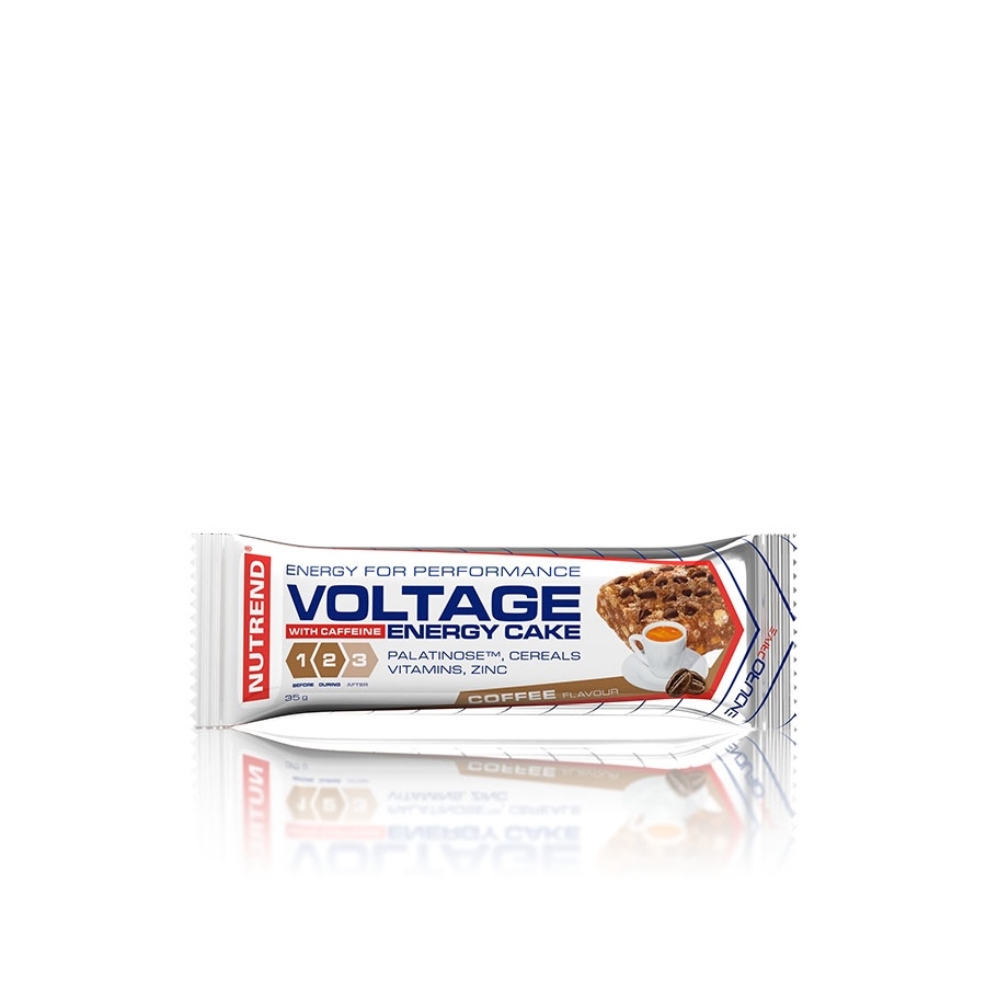 VOLTAGE ENERGY CAKE WITH CAFFEINE: glucose syrup, fructose-glucose syrup, peanuts, cream with hazelnut flavour (sugar, vegetable fat, whey, roasted hazelnuts, cocoa, emulsifier soy lecitnhin, aroma), oat bran, rice-potato extrudate (rice, mashed potatoes, sugar, wheat fibre, red beet), dark chocolate (cocoa mass, sugar, vegetable fat, cocoa, emulsifier soy lecithin), rice flour, PalatinoseTM - isomaltulose (a source of fructose and glucose), soy flakes, vegetable fat (palm, palm kernel, shea), dried milk, emulsifier rape lecithin, wetting agent glycerine, antioxidant additive (E-306, E-304, E-300), aroma, caffeine, zinc gluconate, preservative sorbic acid, vitamin C, vitamin E.