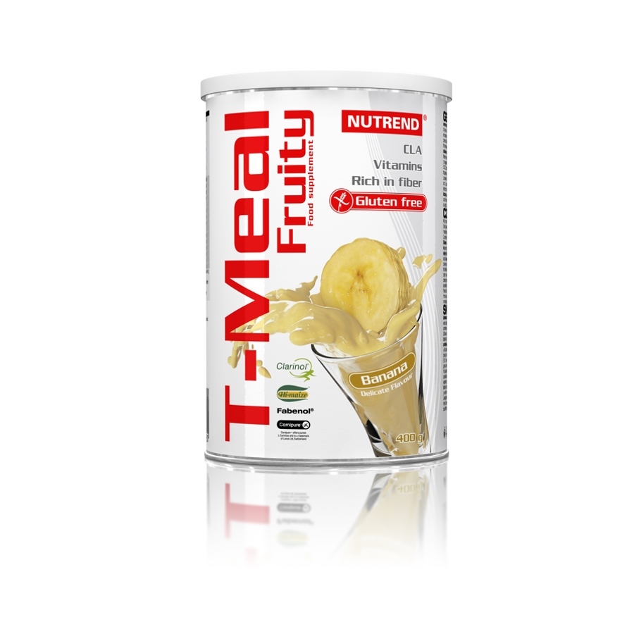 Banana: maltodextrin, calcium caseinate, whey protein concentrate, soy protein isolate, aroma, inulin, corn starch Hi-Maize®, freeze-dried banana 5 %, milk protein isolate, emulsifier soy lecithin, Clarinol® (vegetable - safflower oil, rich in conjugated linoleic acid – CLA 57 %, glucose syrup, sodium caseinate, anti-caking agent E 551, emulsifier E 322, stabiliser E 450, antioxidant E 306), tapioca starch, thickener guar gum, vitamin premix (L-ascorbic acid, DL-α-tocopherol acetate, nicotinamide, calcium D-pantothenate, cyanocobalamin, pyridoxine hydrochloride, riboflavin, thiamine mononitrate, folic acid, biotin), thickener carboxymethylcellulose sodium salt, L-carnitine tartrate, anti-caking agents calcium phosphate and silicon dioxide, sweetener sucralose, extract from beans seeds Fabenol®, sweetener acesulfame K, colouring agent beta carotene. Allergens: lactose, soya.