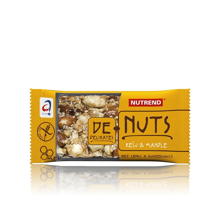 DeNuts cashew + almonds: cashew nuts 30%, almonds 19%, peanuts, glucose syrup, sesame, fructose, honey 4% rapeseed lecithin emulsifier. The product contains allergens cashew nuts, almonds, peanuts, sesame.